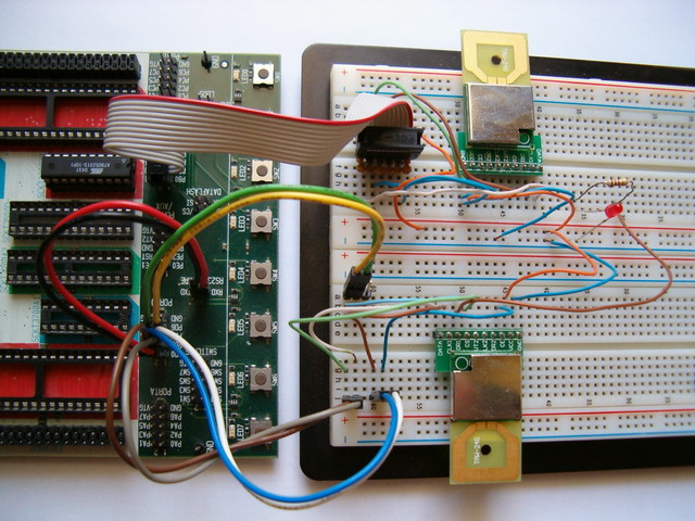 My first attempt with RF modules was with TLP and RLP418 modules. TLP and RLP418 modules work at 418 MHz with slow data-rate (typical 4.8 kbits/sec). The TLP-418 module transmits and the RLP-418 module only receives data. You can't make a bi-directional communication with only one couple of this modules. The solution of this problem is the use of TRW-24G transceiver modules (transceiver = transmitter + receiver). This modules work at 2.4 GHz frequency with GFSK modulation, and the data-rate is 250Kbps and 1Mbps (1 mega bit/second!)