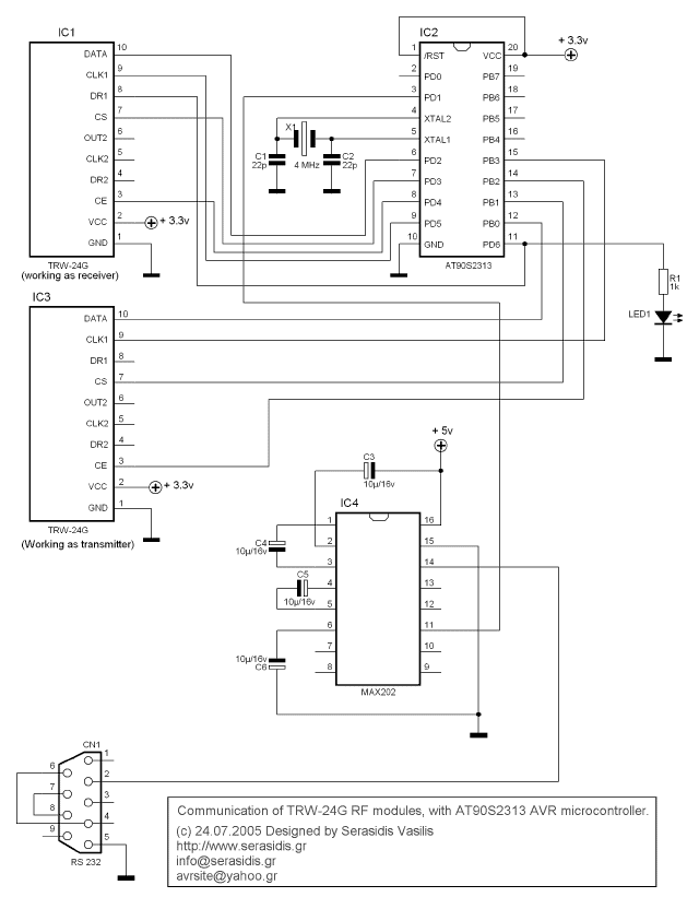 My circuit is constituted by 2x TRW-24G modules, 1x AT90S2313 microcontroller and 1x MAX202 TTL to RS232 voltage level converter. The RF modules work with +3.3V not with +5V. I connected this modules to STK500 development board and I set the VTG voltage to 3.3V from programmer's software in AVRstudio. For serial communication I used the internal MAX202 of STK500 board, that works at +5V power supply. There is no problem with that, but the AT90S2313 MUST work at 3.3V or else you will burn the RF modules if you send +5V instead +3.3V (max. 3.6V).