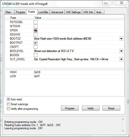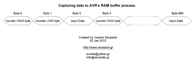 Do not useregular alcaline 1.5V batteries instead of rechargeable. The total voltage is 4 x 1.5 = 6V. This voltage will probably burn theLCD and theAVR microcontroller. The software (firmware) Picture 5: The data capturing process. As you can see on Picture 5 the data buffer is constituted by 870 bytes (v1.00) 2 for the counter and one for the input pins information. In version 1.01 the data buffer was decreased to 256*3=768 bytes for increasing the capturing speed because the buffer size variable is 8 bit instead of 16 bit that I used before. The next byte calculations must be done according to the firmware versionyou use. How it works? It is simple. After the power ON the AVR waits for a trigger pulse on any of 4 input pins. If a trigger pulse is detected the AVR starts counting the time is needed for the next trigger on any of the 4 input pins. The sample length is stored in a 16-bit variable named "counter". When this variable overflows, the status of the 4 input pins and the counter value are stored in the buffer and its address is increased by 3 (2 bytes for counter and 1 bytefor input pinsdata). This process is been made until the AVR fills all the buffer bytes (870/3 = 290 samples or triggers). When the AVR fills the buffer, all the data are appeared on LCD as a graph. You can move the graph to the left ( button S3) or to the right (button S4) to watch the entire data sequence. If the data sequence is in a low speed you can shrink the graph (zoom out) with a2, 4, 8, 16, 32, 64, 128, 256, 512, 1024, 2048, 4096 or8192 ratio by pressing the S2 button. Programming The ATmega8 Burn the ATmega8 with miniLogicAnalyzer.hex and select external crystal at the fuses section. The fuses that must be set onATmega8 microcontroller.